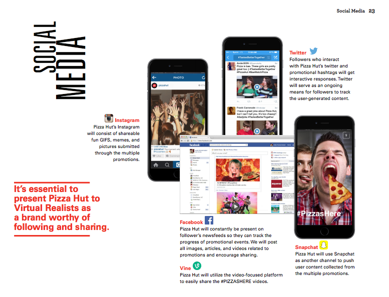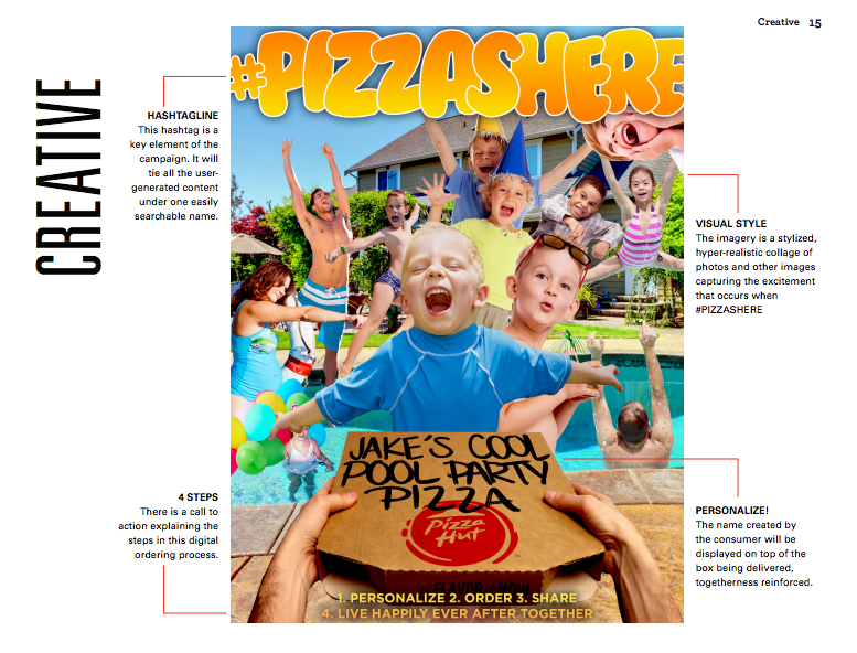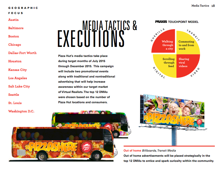 This past Spring, 13 other advertising students and I participated in the National Student Advertising Competition. Our client was Pizza Hut and the objective of the campaign was to increase online ordering. My job during this process was to help create and execute promotional events, and advertisements both traditional and non-traditional. I then pitched our campaign to a panel of judges in a 20 minute presentation.